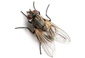 The housefly, Musca domestica, is a fly of the suborder Cyclorrhapha. It is believed to have evolved in the Cenozoic era, possibly in the Middle East, and has spread all over the world. It is the most common fly species found in habitations. Adult insects are grey to black with four dark longitudinal lines on the thorax, slightly hairy bodies and a single pair of membranous wings. They have red eyes, and the slightly larger female has these set further apart than the male. The female housefly usually mates only once and stores the sperm for later use. She lays batches of about 100 eggs on decaying organic matter such as garbage, carrion or feces. These soon hatch into legless white maggots which after 2 to 5 days of development transform into reddish-brown pupae, about 8 mm (0.3 in) long. Adult flies normally live for 2 to 4 weeks but can hibernate during the winter. The adults feed on a variety of liquid or semi-liquid substances beside solid materials which have been softened by saliva. They carry pathogens on their bodies and in their feces, and can contaminate food and contribute to the transfer of food-borne illnesses. For these reasons they are considered pests.